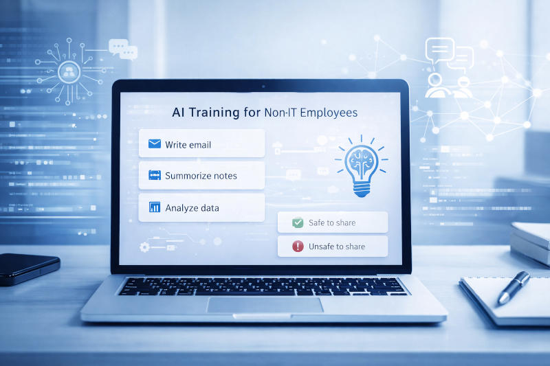 Unser Vor-Ort-KI-Training ist angepasst auf Nicht-IT-Mitarbeitende wie Vertriebs-, HR- und Office-Teams sowie Führungskräfte. In einer kurzen 1,5–2-stündigen Sitzung lernen die Teilnehmenden, wie KI bei täglichen Aufgaben unterstützen kann, welche Nutzung sicher bzw. unsicher ist und wie sie sensible Informationen schützen. Das Training hilft Teams, effizienter zu arbeiten und KI-Tools sicher und verantwortungsvoll einzusetzen.